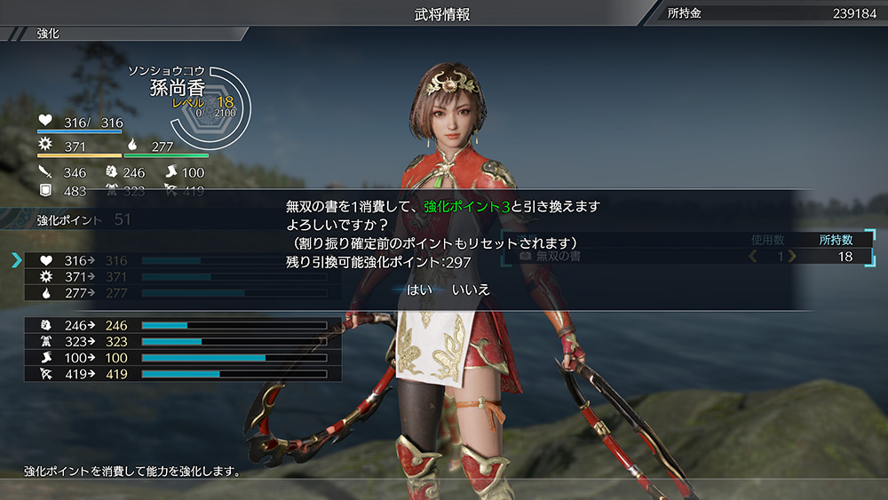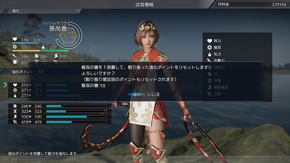 強化ポイントが割り振られているステータスに合わせて「強化ポイントのリセット」を実行すると、無双の書を1つ消費して、割り振られていたすべての強化ポイントがリセットされる。 -