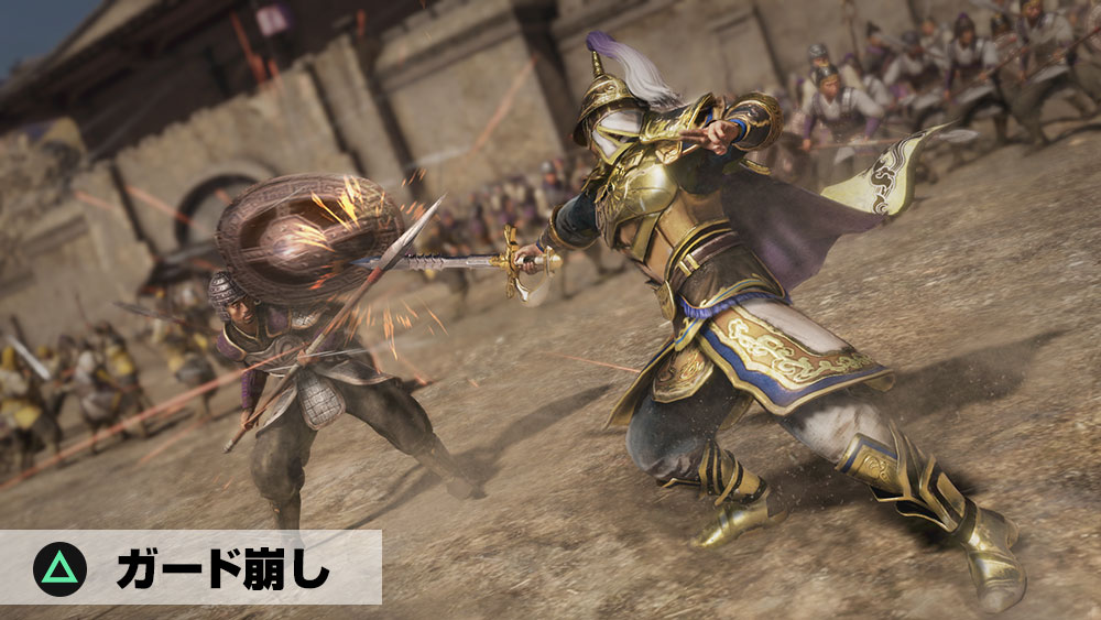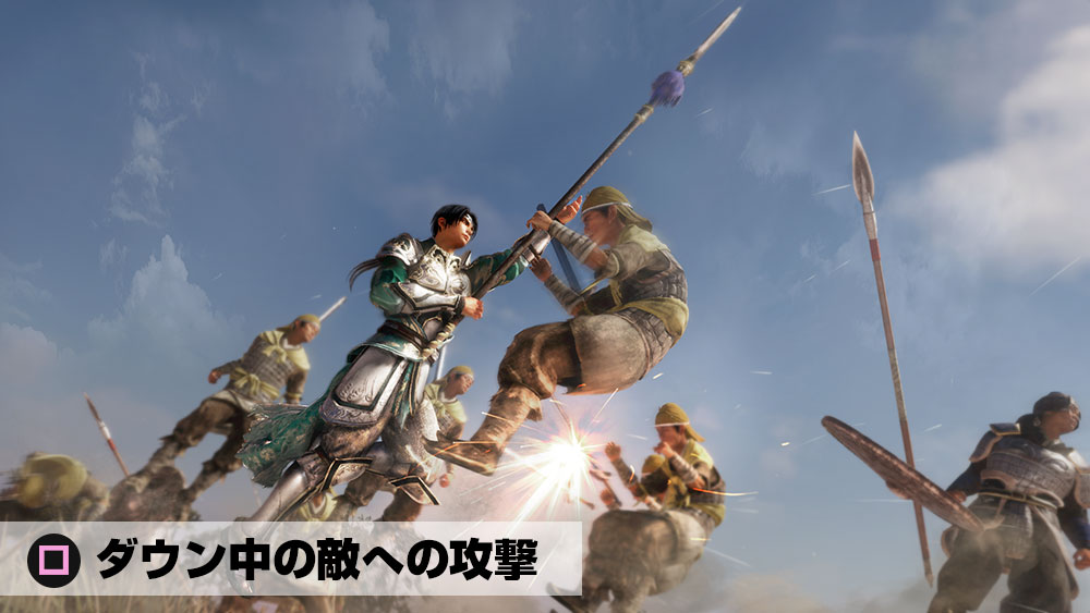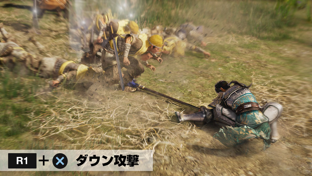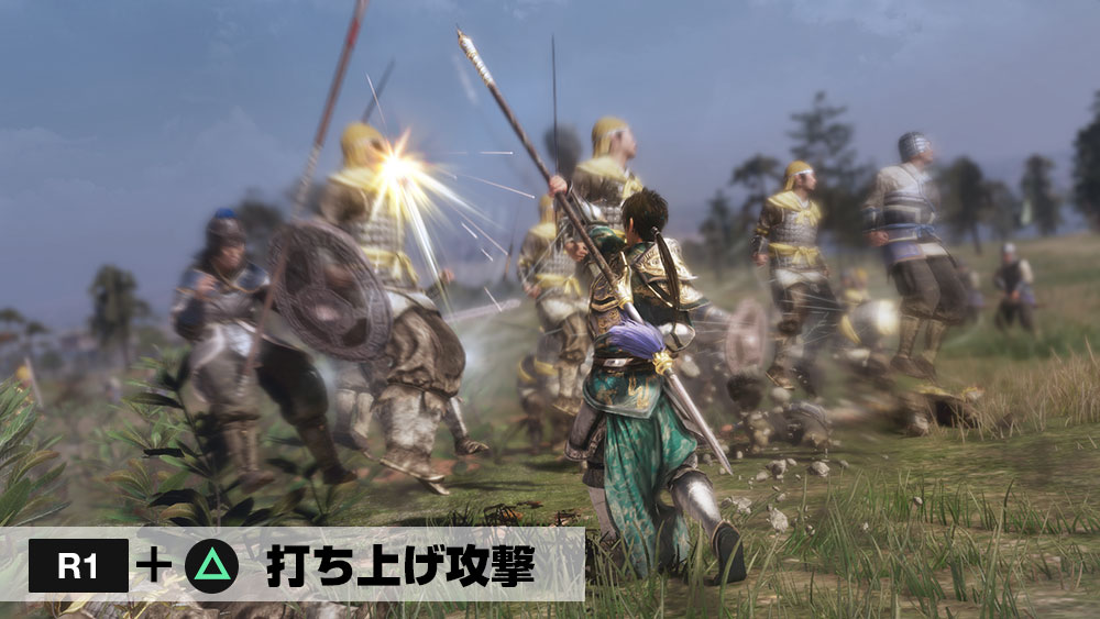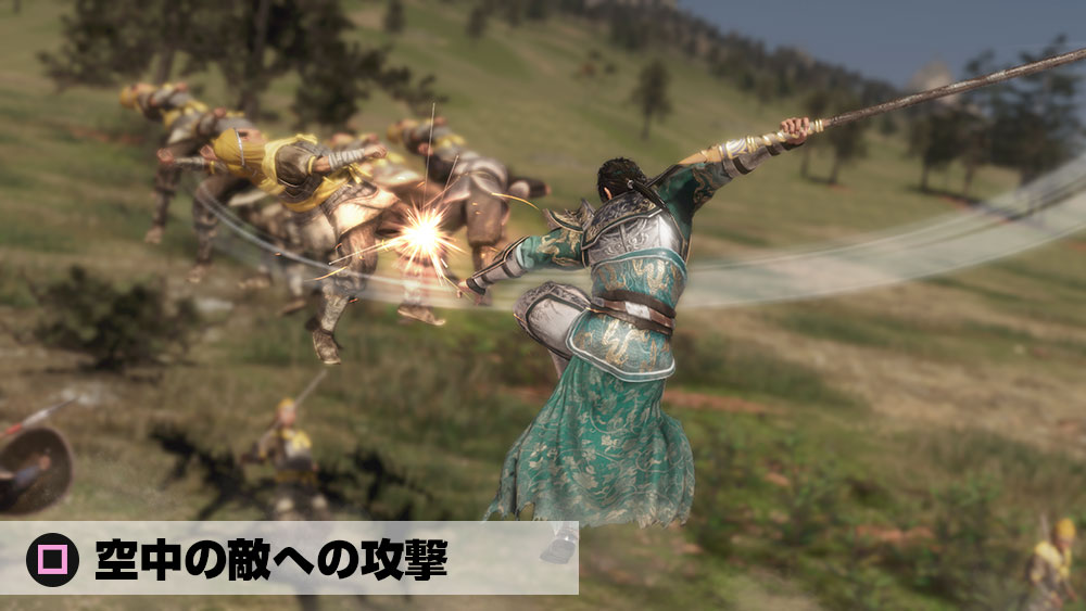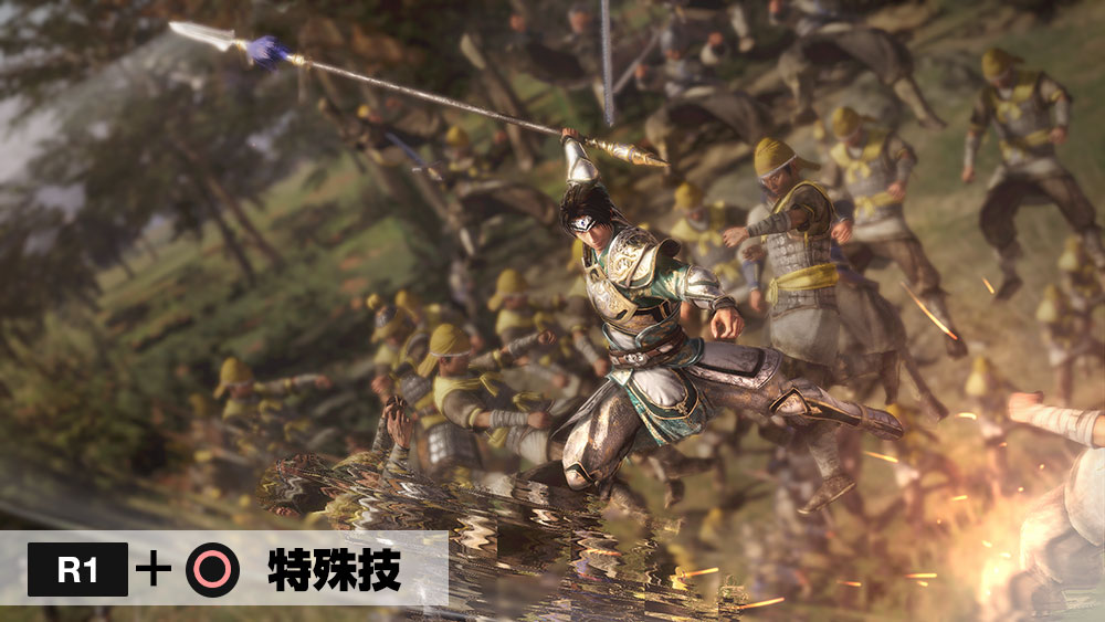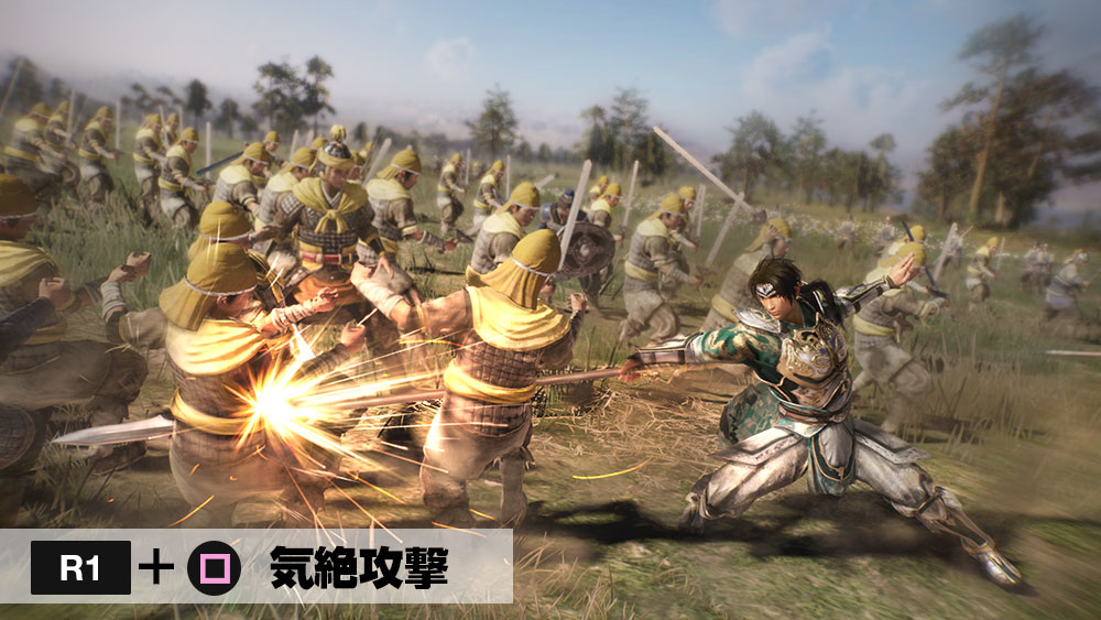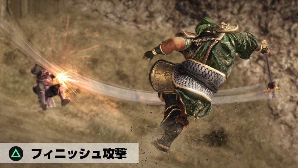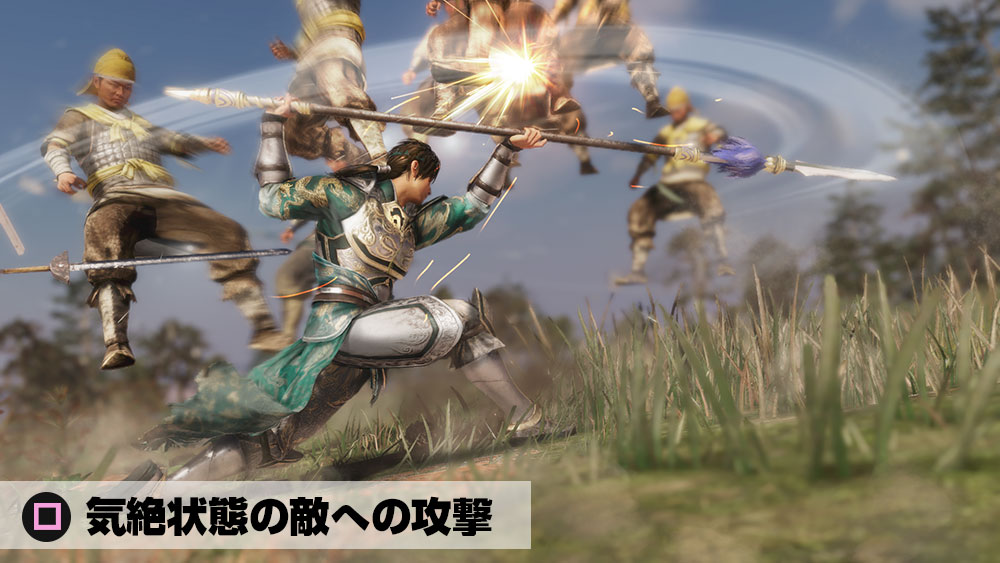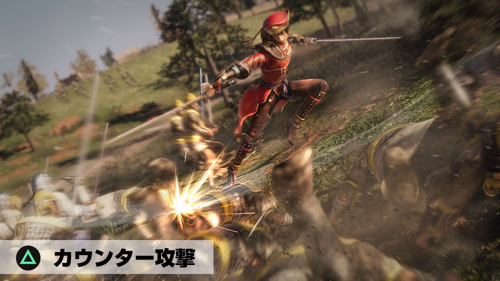 簡単操作で楽しめる一騎当千の爽快感はそのままに、敵の状態によって変化する「フロー攻撃」、有利な状況を作り出す「リアクト攻撃」、コンボの起点となる「トリガー攻撃」を駆使して多彩なアクションを組み立てることができる新システム。[ガード崩し(リアクト攻撃)]→[連続攻撃(フロー攻撃)]→[打ち上げ(トリガー攻撃)]→[追い討ち(フロー攻撃)]→[地面に叩きつける(リアクト攻撃)]など、3つの攻撃を切り替えながら様々な局面に対処することで、自由自在で止め処ないアクションを楽しむことができる。