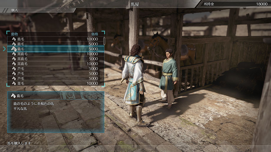プレイヤーは初期状態でも馬に乗ることができるが、街や村にある「馬屋」でより優秀な馬を購入することもできる。
