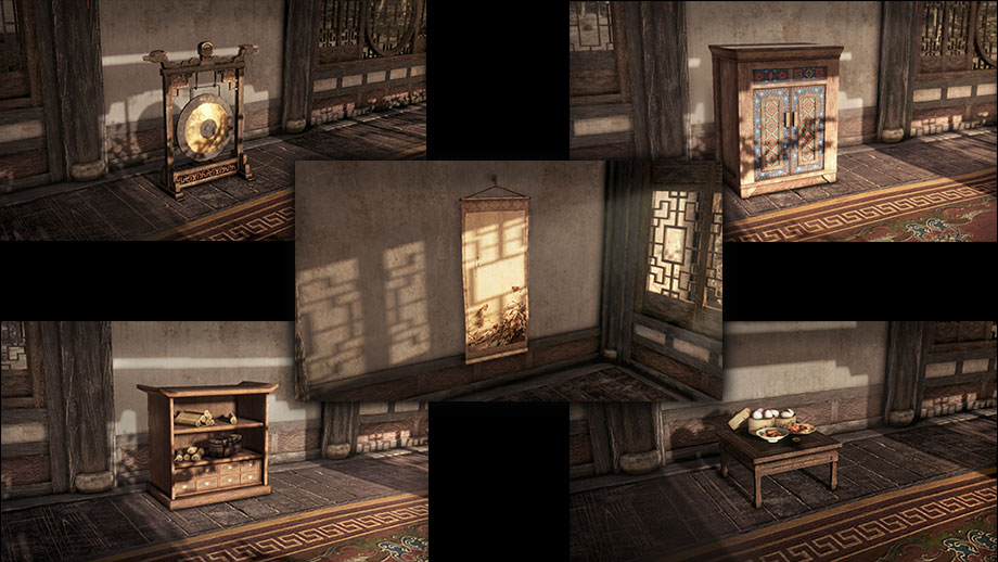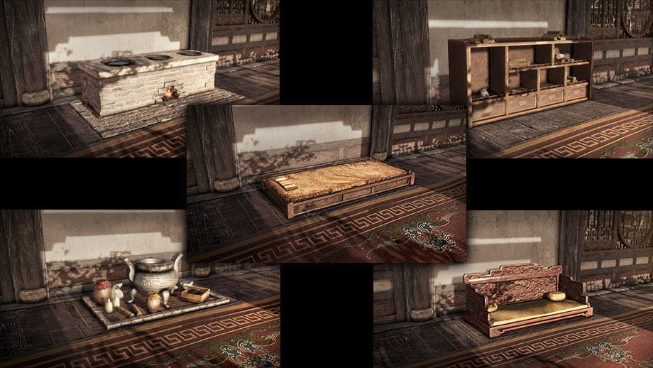 さらに、衣装を着替えることができる「服飾箪笥」や隠れ処で流すBGMの設定が可能な「銅鑼」をはじめ、さまざまな家具や装飾を配置して、お気に入りの部屋に仕上げていくことができる。