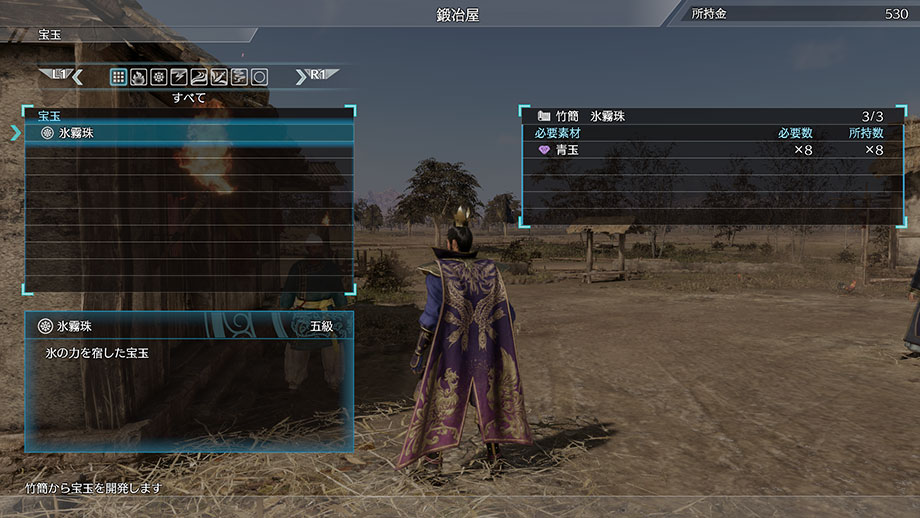 武器やアイテムなどを開発するには、必要な素材が書かれた「竹簡」を集めて完成させる必要がある。