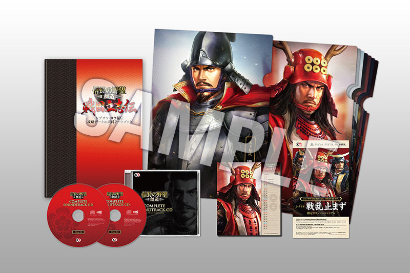 ゲームソフトに、秘伝の攻略データと武将の美麗イラストを堪能できる「シブサワ・コウ秘伝攻略データ&武将アートブック」や、本作の使用楽曲に加え『創造』『創造withパワーアップキット』の楽曲も全て収録した「サウンドトラックCD(2枚組)」、新規描き下ろし武将たちのイラストを使用した「武将アートクリアファイル(10種)」「特製卓上カレンダー」、限定シナリオ「戦乱止まず」を同梱!