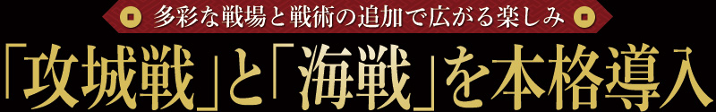 大名の命令を受けて出陣する「家臣」や、配下の武将たちを率いて全軍を指揮する「大名」など、合戦においてもプレイする武将の身分の違いが反映され、よりリアルな合戦をお楽しみいただけます。また合戦の舞台は「野戦」だけでなく「攻城戦(籠城戦)」と「海戦」にも拡大。迫力のビジュアルで本格的な攻城戦や海戦を演出します。