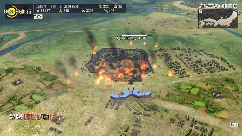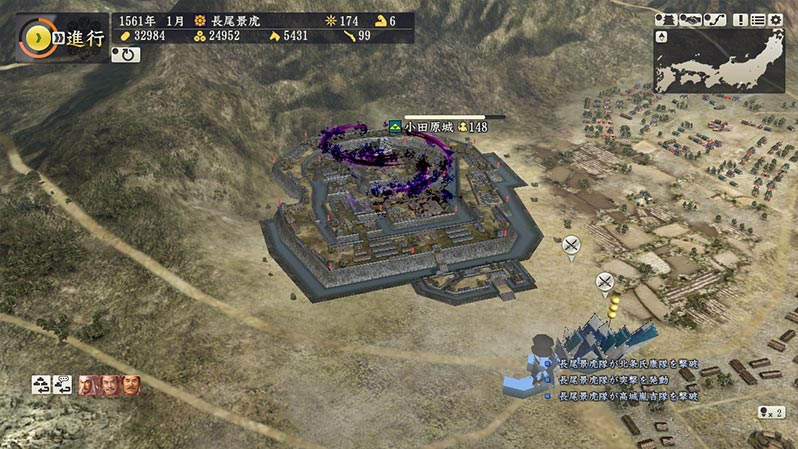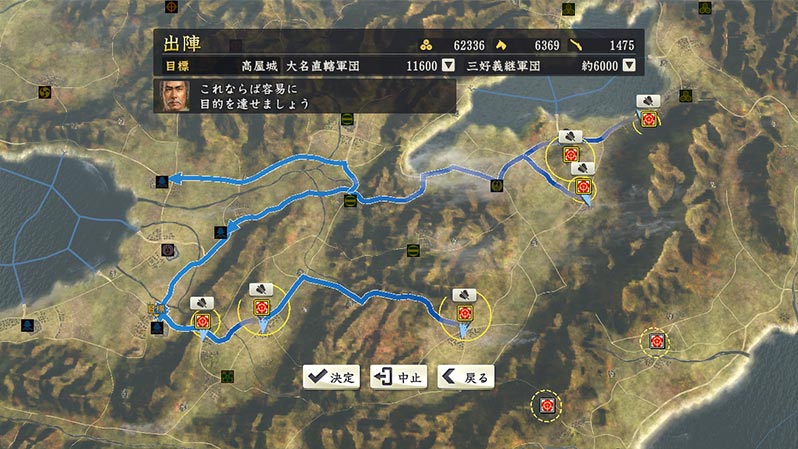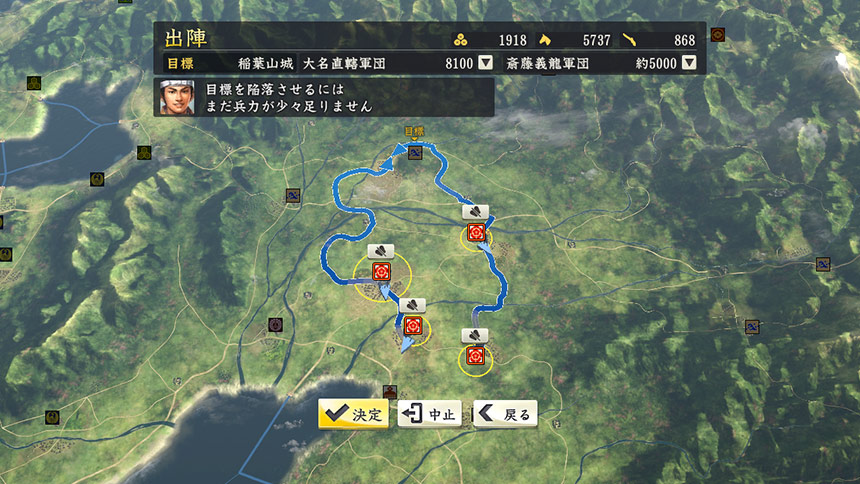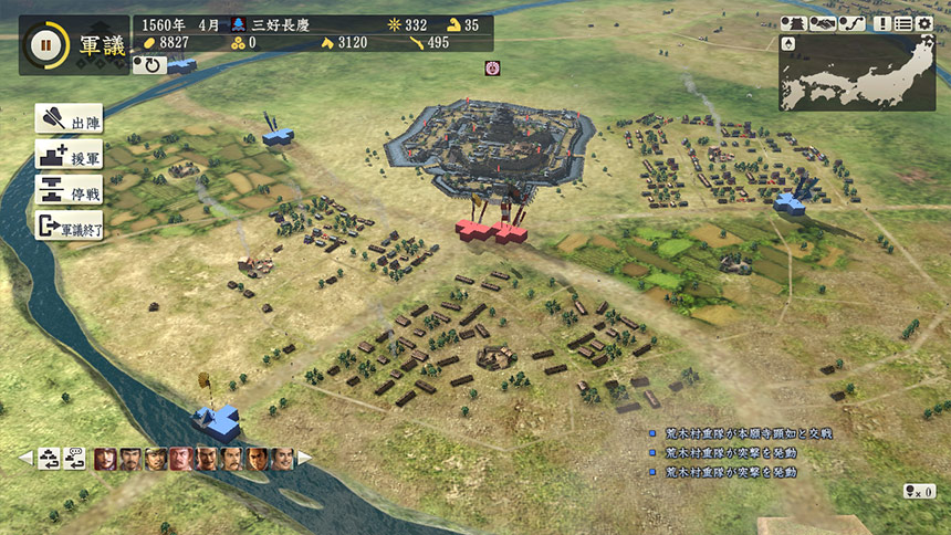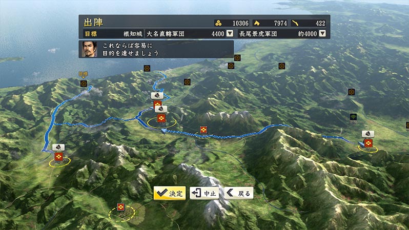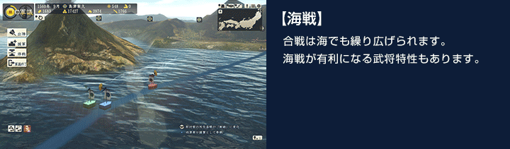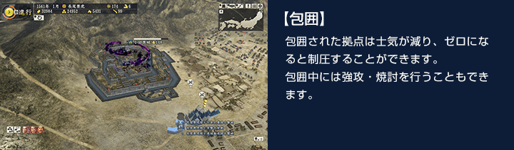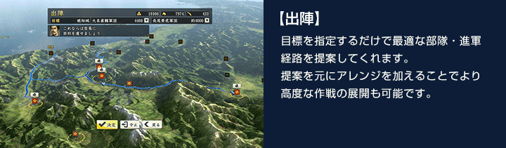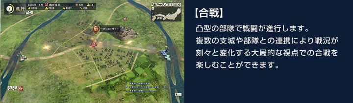 俯瞰視点では複数部隊に進軍ルートを指示することで複数の城を攻めることができます。陽動、挟み撃ちなど多面作戦により幅広い戦術が可能になることで、これまで以上に「リアルで多彩な戦国合戦」を楽しむことができます。