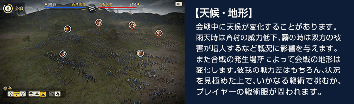 合戦が行われている場所や天候、時間帯などによって異なる表情が再現されることで、戦場の空気感を演出します。