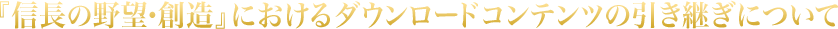 『信長の野望・創造』でインストール済のダウンロードコンテンツについては、『信長の野望・創造 with パワーアップキット』付属の「データ引き継ぎツール」を使用する、あるいは発売日以降に配布予定のSteam CDキー(ダウンロードコンテンツ用)を利用することで引き継ぐことができます。