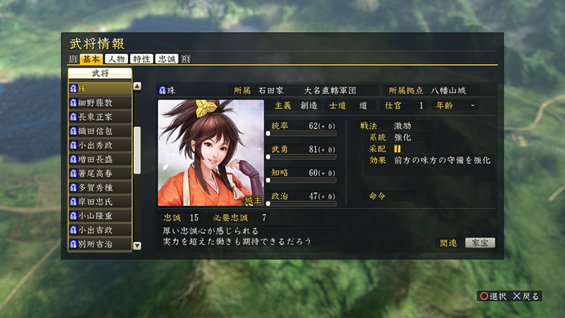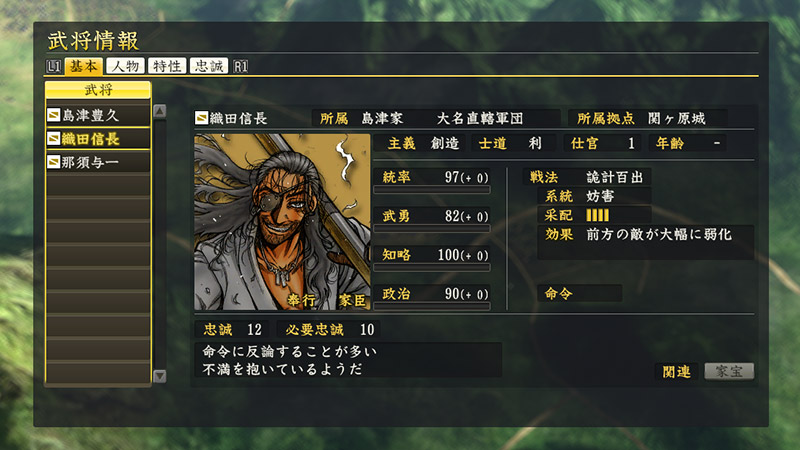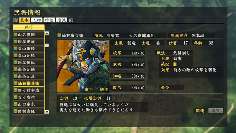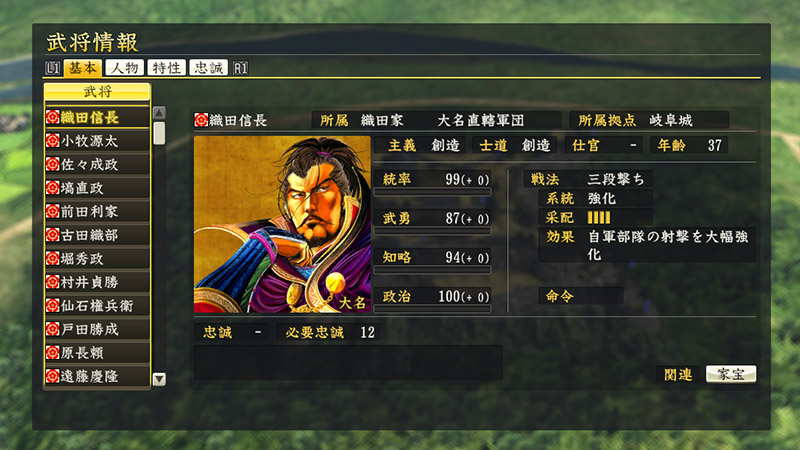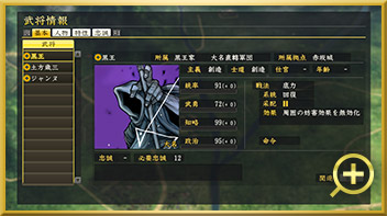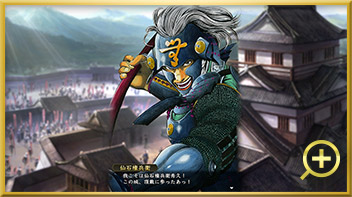 仙石権兵衛 / 織田信長 / 武田信玄 / 山県昌景 / 馬場信春 / 羽柴秀吉 / 徳川家康 / 石田三成 / 今川義元 / 上杉謙信 / 本願寺顕如 / 黒田官兵衛 / 竹中半兵衛 / 明智光秀 / 柴田勝家 / 長宗我部元親 / 雑賀孫市(鈴木重秀) / お市