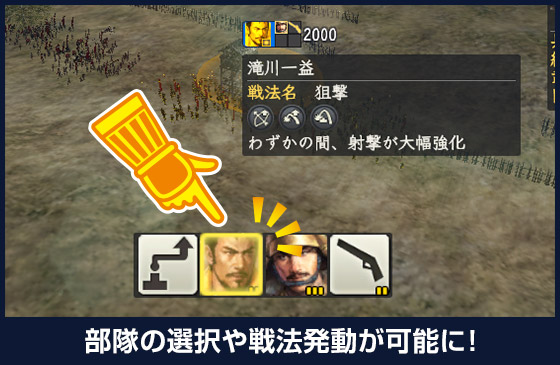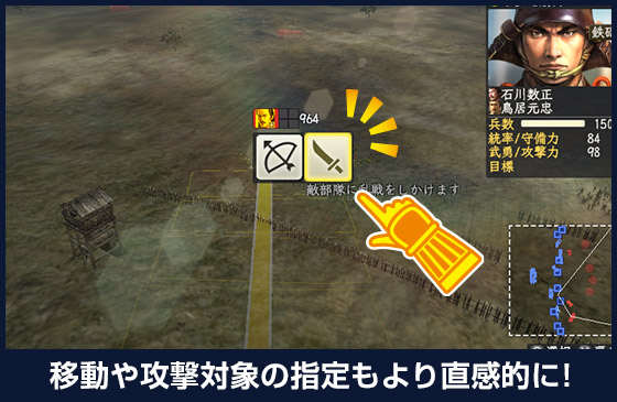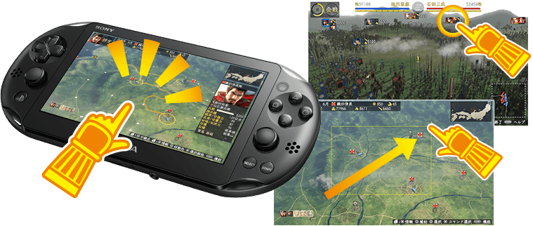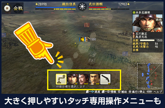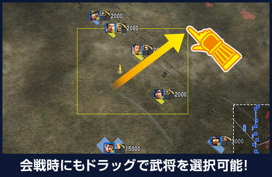 スクロールやズームイン/アウトはもちろん、 全国マップでは複数部隊をドラッグで一度に選択可能。 さらに、会戦画面では部隊の移動や攻撃対象をタッチで指定できる。 直感的な操作で縦横無尽に駆け巡れ!