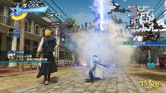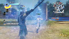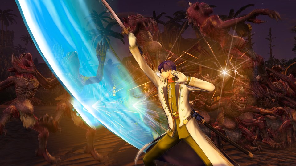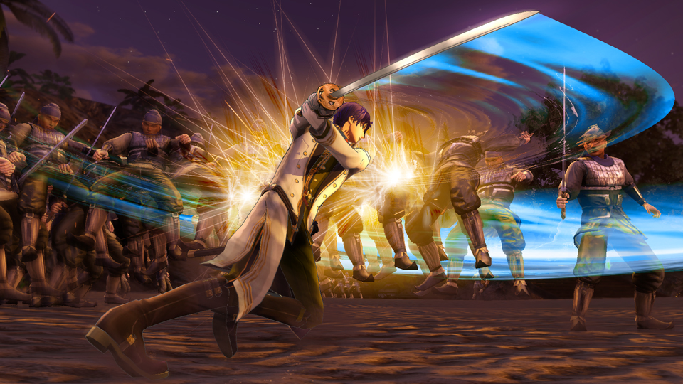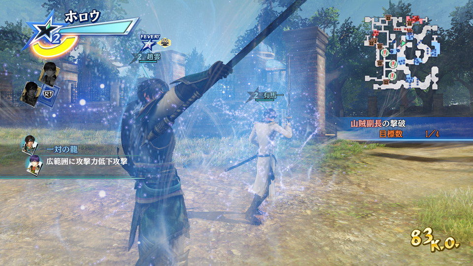 趙雲と有馬一の合体スキル「一対の龍」。趙雲が「ストームラッシュ」で打ち上げた敵を、有馬一が青龍の力をまとった刀で斬り払う。