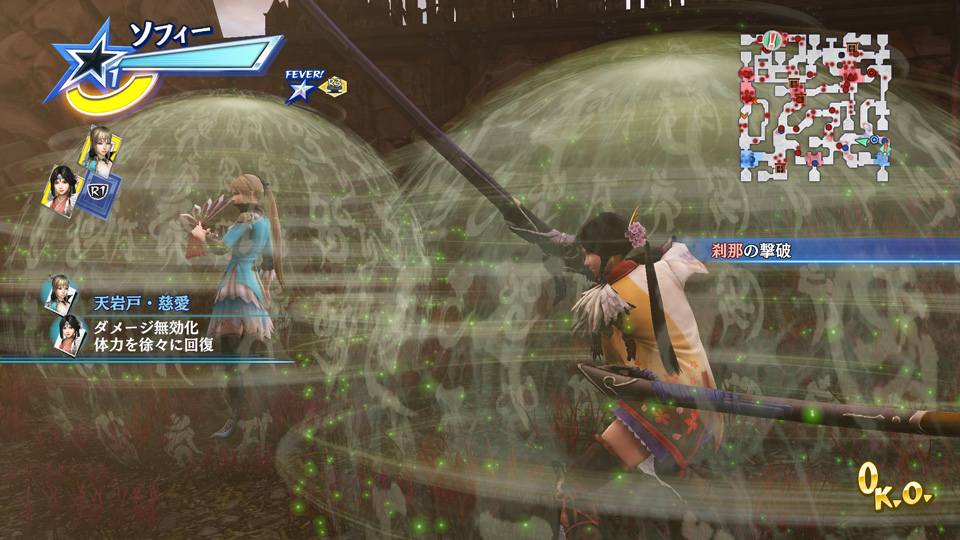 合体スキル「天岩戸・慈愛」。桜花の「天岩戸」による攻撃の無効化と、王元姫の「慈愛の言」による体力回復を同時に行う。