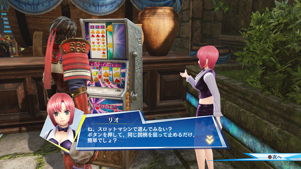 スロットマシンを見たことがない真田幸村に、リオが優しく遊び方を教えてあげている。