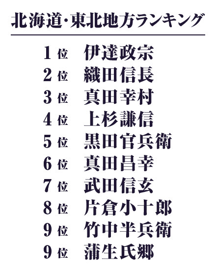 北海道民の方に選ばれたのは「織田信長」でした。戦国時代といえば、信長が真っ先に思いつくなどの理由で票が集まりました。地域総合ランキングに名を連ねている蒲生氏郷や伊達政宗などもしっかり好位置をキープしていました。