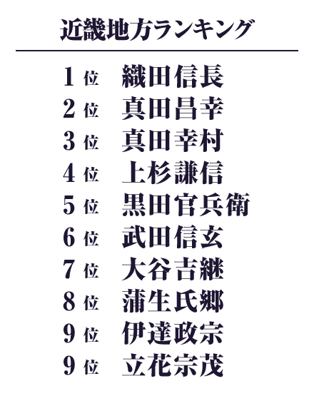 第1位から第3位までがすべて1票差の大激戦を制し、兵庫県の第1位になったのは「織田信長」でした。ちなみに、第2位は「黒田官兵衛」、第3位は「真田昌幸」でした。「織田信長」は、今回の対象である近畿地方の主要部の京都、大阪、兵庫においてすべてトップを獲得しており、近畿地方での武将人気ランキングナンバーワンに輝いた原動力になりました。