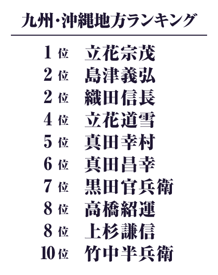 長崎県では「真田昌幸」が1位でした。昌幸には及ばないものの、「島津義弘」や「黒田官兵衛」、「立花道雪」など、九州にゆかりのある戦国武将も名を連ねました。