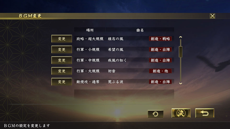 華麗なる決断 (桶狭間のテーマ-勇壮-)、猛虎伏草 (武田家のテーマ)、忍び寄る闇 (包囲戦)などが、本作でも使用できるようになります。