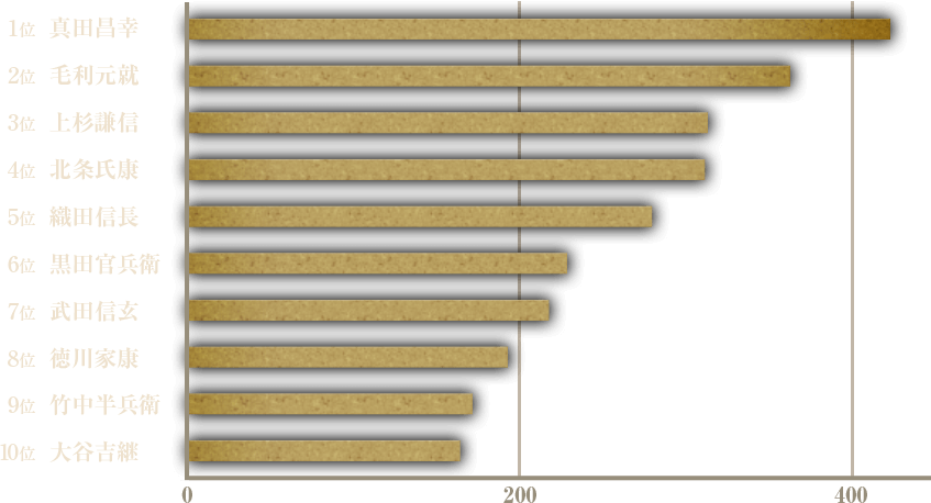 父が息子たちに諭す有名なエピソード「三矢の教え」から「良き父親」を連想した方が多く、ランクイン。それ以外にも、家族への文を欠かさない“筆まめ”であった逸話や、子供だけでなく夫婦の仲睦まじさも高評価でした。さらに、「地元の武将だから」という理由で投票された方も多く、地元で愛されている武将としても票を伸ばしました。