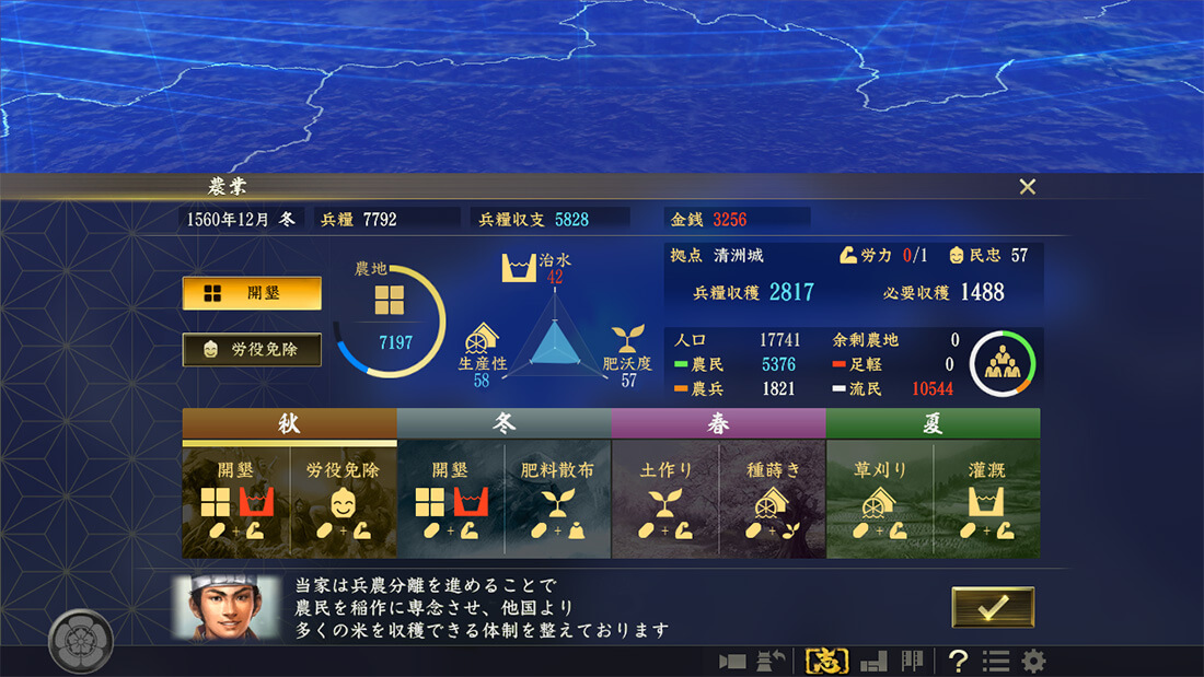 | 灌漑 | 夏 | 田の灌漑作業に人手を投入することで、実行した拠点の「治水」が上昇する。治水が高まると、収穫が増加するとともに、災害の被害が抑えられる。 |
