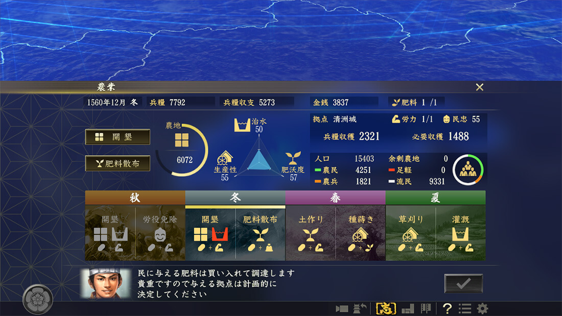 | 肥撒き | 冬 | 農民に質の良い肥料を与えることで、実行した拠点の「肥沃度」が上昇する。肥沃度が高まると、長期間、安定した収穫がもたらされる。 |