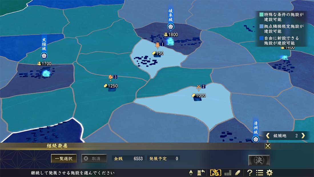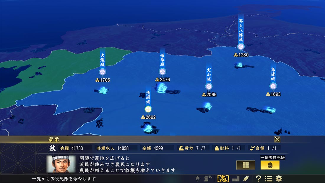 また、その際に費用がいくら必要で、どのような効果が得られるか(兵糧収入や農地、治水などの増減値)を、一覧で表示します。どの拠点に命令を行うと効率がいいかがわかりやすくなっています。