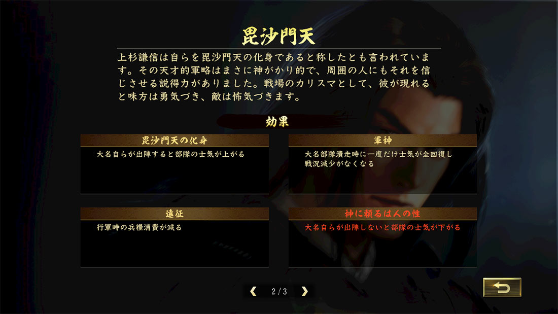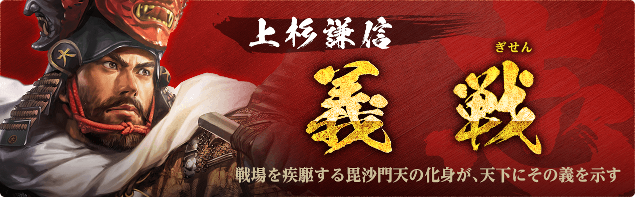 戦闘に特化しており、謙信自らが出陣することで自軍の士気が上昇する。ほかにも自部隊が潰走しても一度だけ士気が回復したり、行軍中の兵糧消費が減る効果もある。しかし、謙信が出陣しない戦では、自軍の士気が下がる。そのため、つねに謙信自身が部隊を率いて出陣する必要があり、どのように軍を指揮し、領地拡張を行うかプレイヤーの手腕が問われる。
