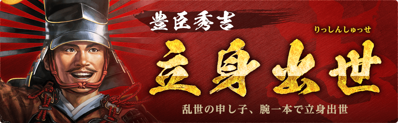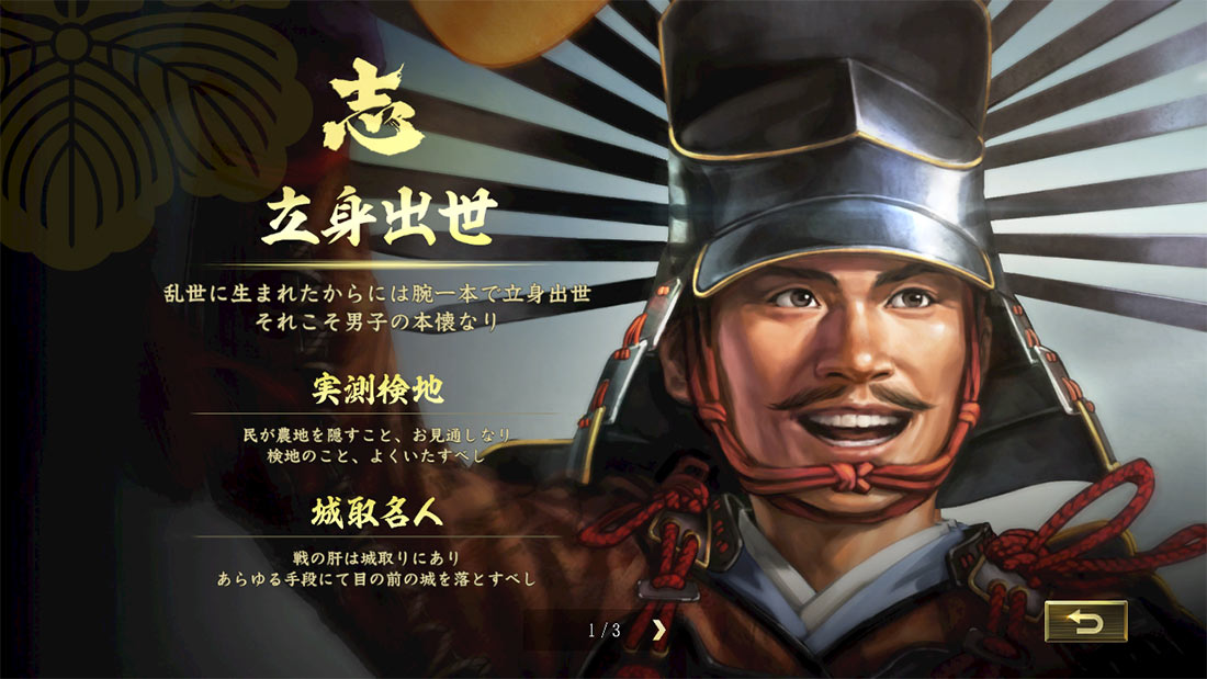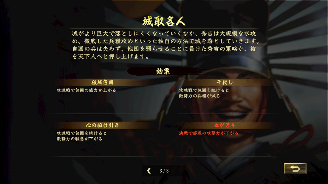 城取に関して、希代の名手だった秀吉の戦歴を表した志特性で、攻城戦を仕掛けた際に絶大な効果を発揮する。敵拠点を包囲すると敵の士気だけでなく兵糧、さらには敵勢力の戦意までも下げることができる。