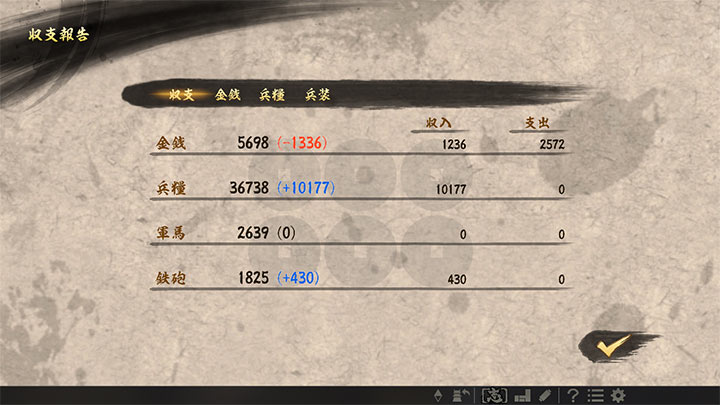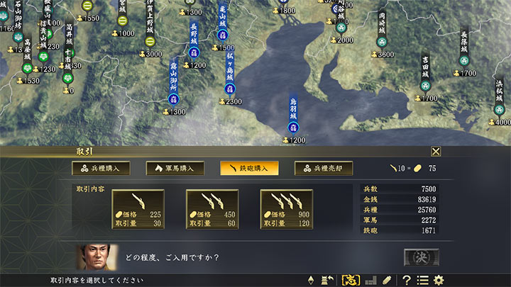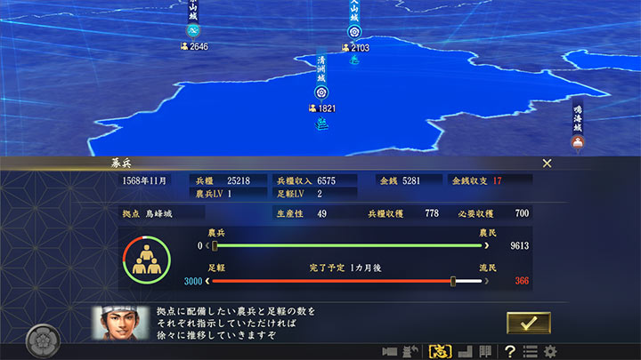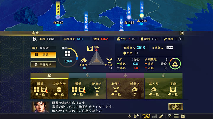 ただし収穫が少なすぎる拠点では民忠が大きく下がるため、収穫量と農兵の数のバランスに注意を払わなければならない。