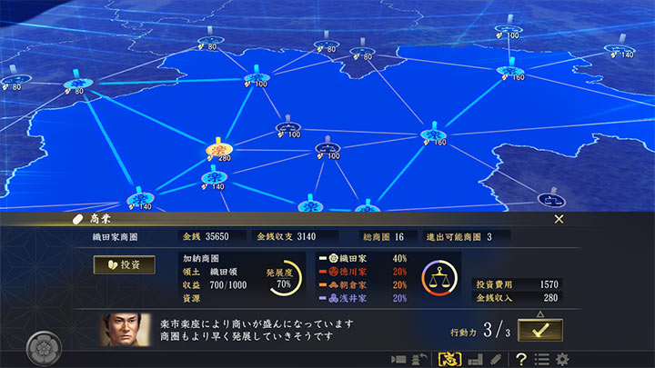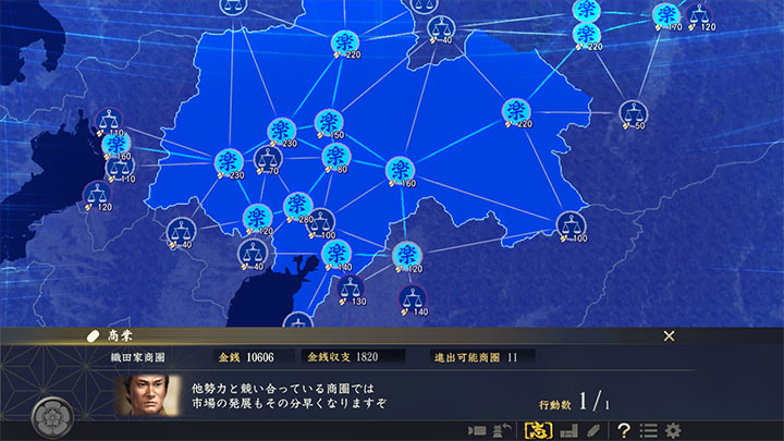 織田家の影響下にある「商圏」は「楽市楽座」となる。自由な経済活動の下では、商圏の成長が高まり、商人たちからの支持も得られるため、自家の影響力も強化される。