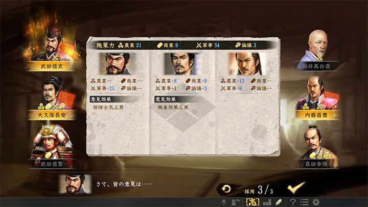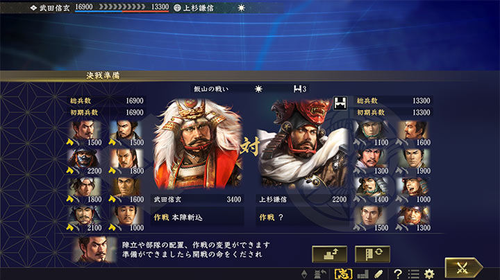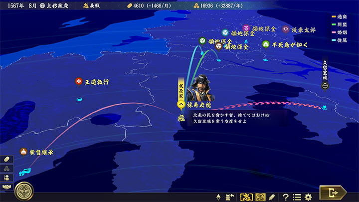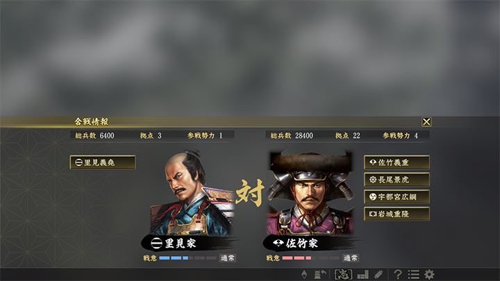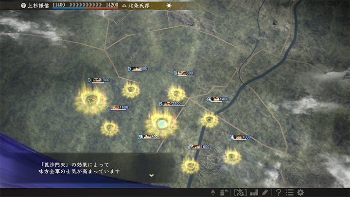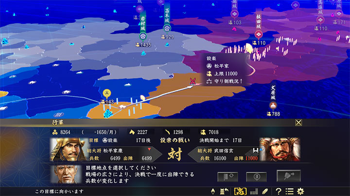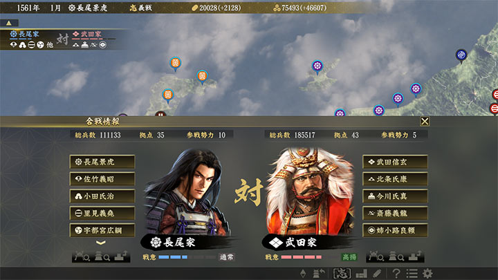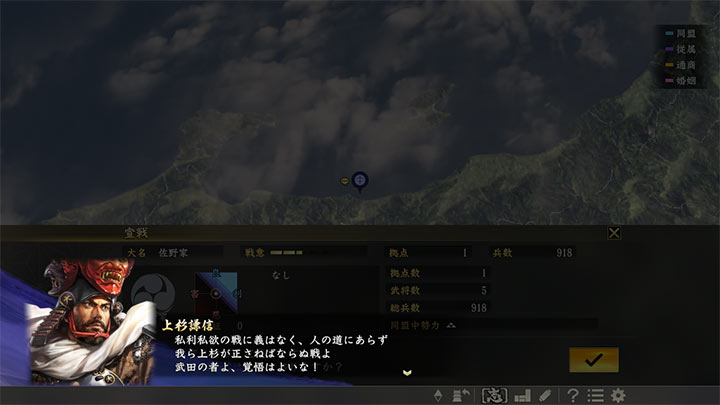 だが、敵勢力が自勢力より小さいと、決戦で勝利しても戦意が上がりにくいデメリットもあるため、周辺勢力との駆け引きを考えていくことが上杉家に求められる基本的な戦略となる。