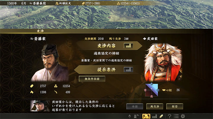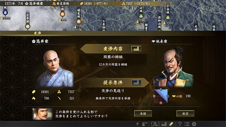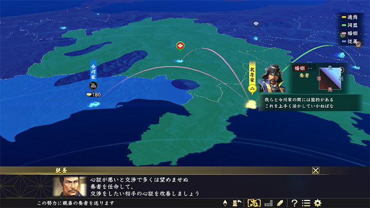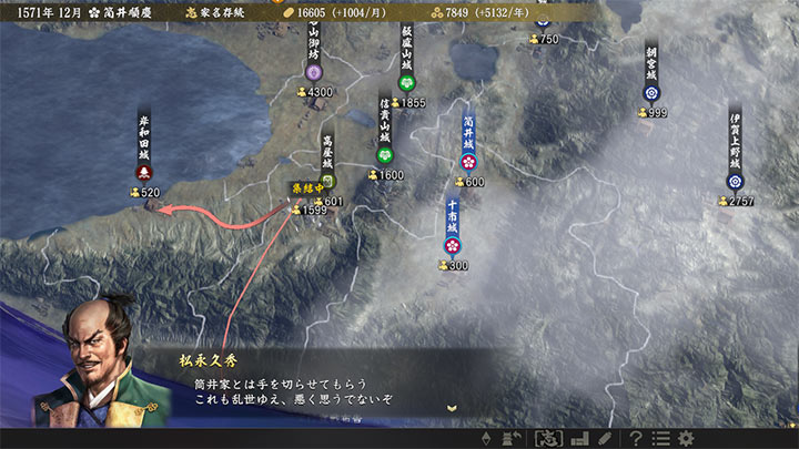 ただし、友好関係や同盟関係になったかといって、安心してはいけない。自身の目標に対して障害となる場合は、抵抗なく手切れをしてくる。久秀に接近するならば、細心の注意を払うべきだ。