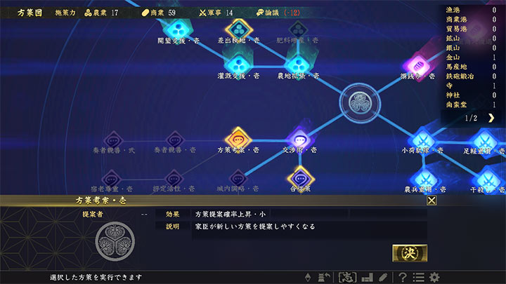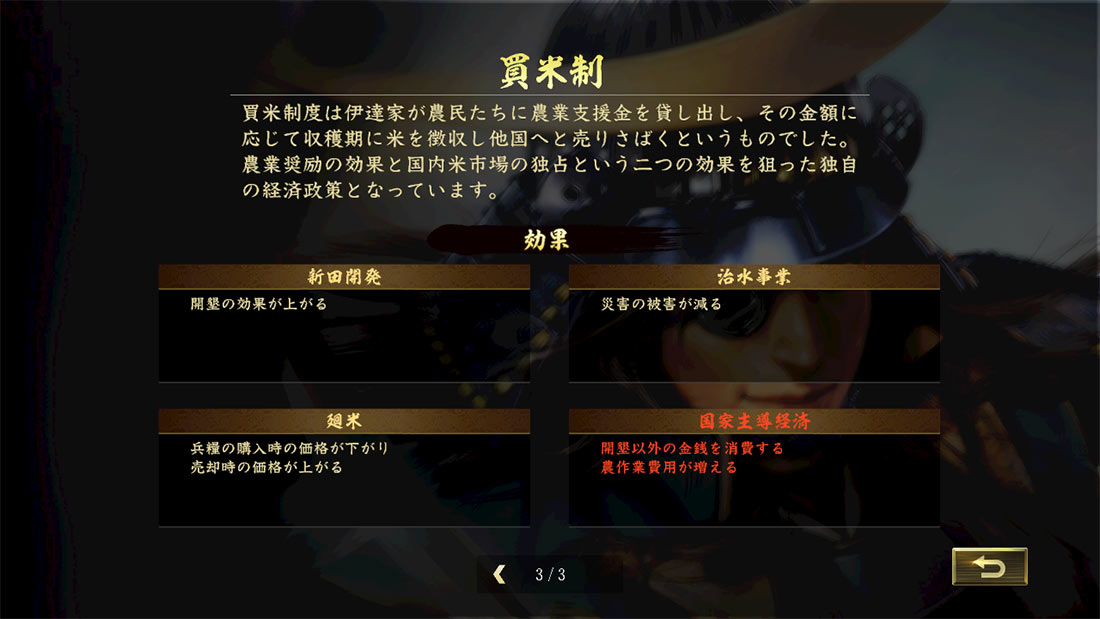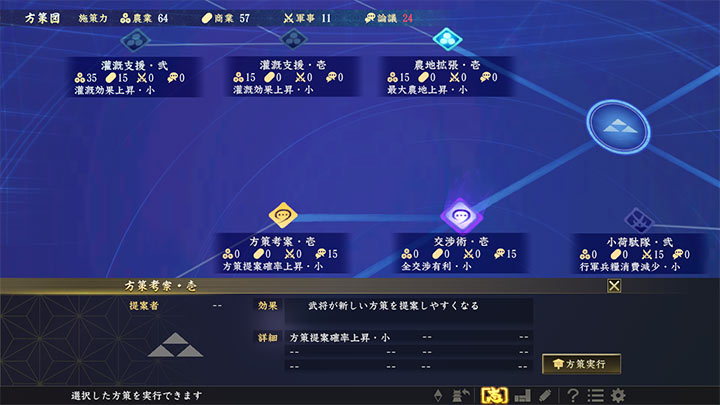 また、兵糧の購入時の価格が下がり、売却時の価格が上がるため、兵糧による金銭収入を獲得しやすい。ただし、勢力全体で農業を支援するありかたにより、開墾以外の農作業費用が増えてしまうデメリットがある。