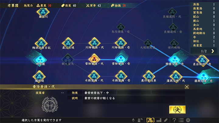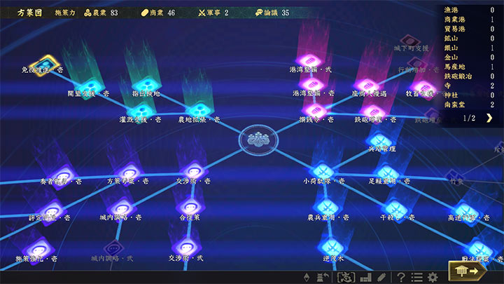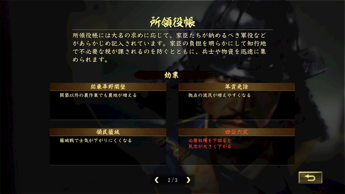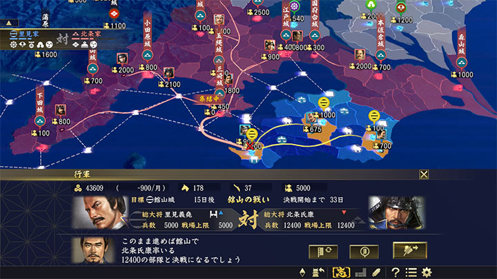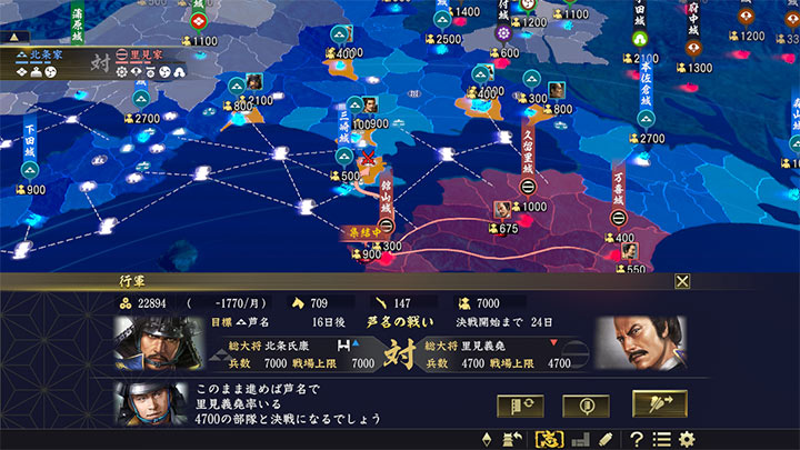 そのため、プレイヤーは関東平野を中心とした領地で農業を中心に国力を高めることで人口を増やし、軍事方策の遅れを農兵の大量動員でカバーする戦略が有効になる。