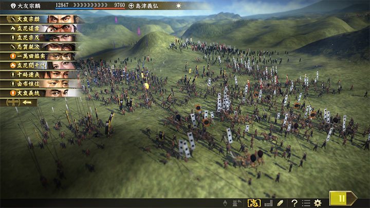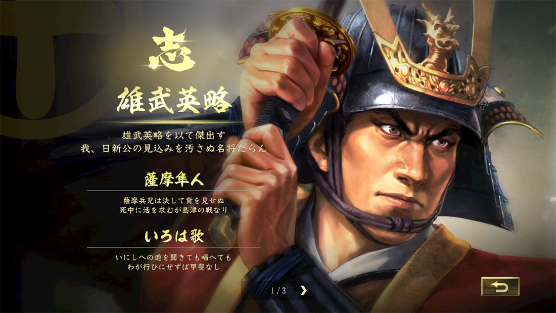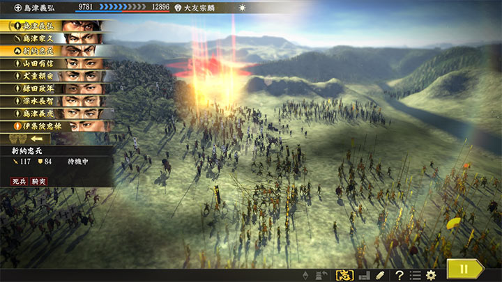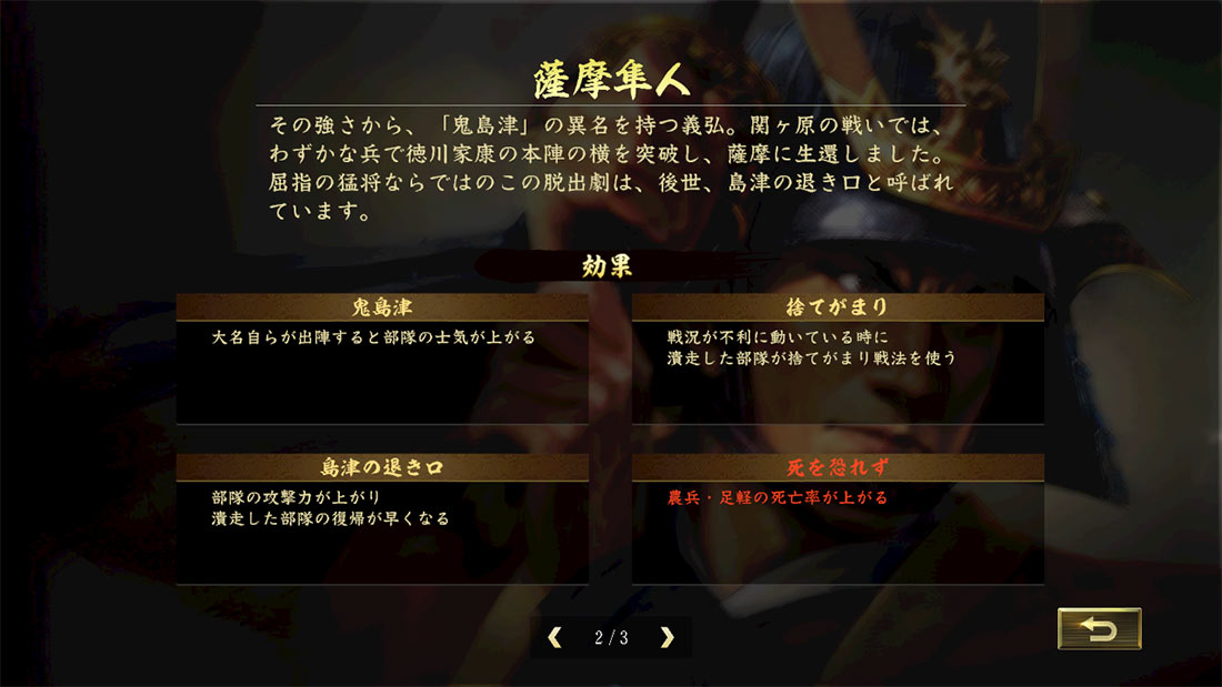 大名自らが出陣すると部隊の士気が上がる。また、部隊の攻撃力が上がり、潰走時の復帰が早くなるといった決戦に特化した特性を持つ。戦況が不利なときに、潰走中の部隊が「捨てがまり戦法」を発動する。これは潰走中でも近づいた敵に反撃する特徴的な戦法だ。