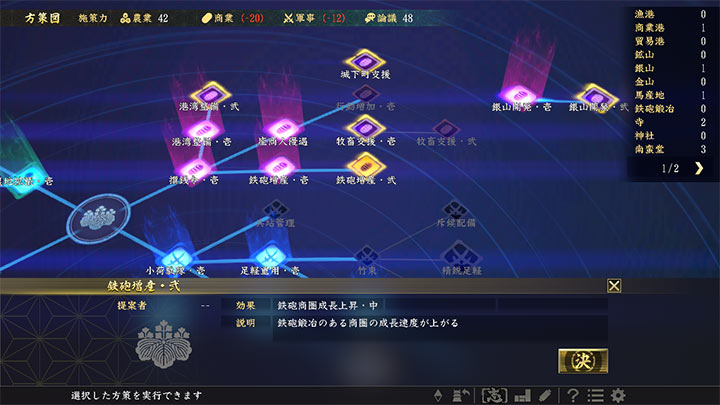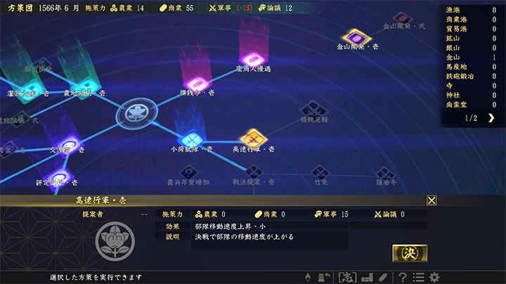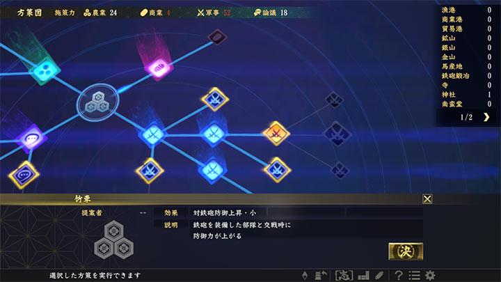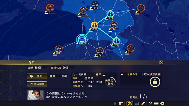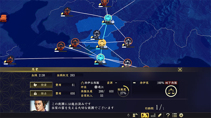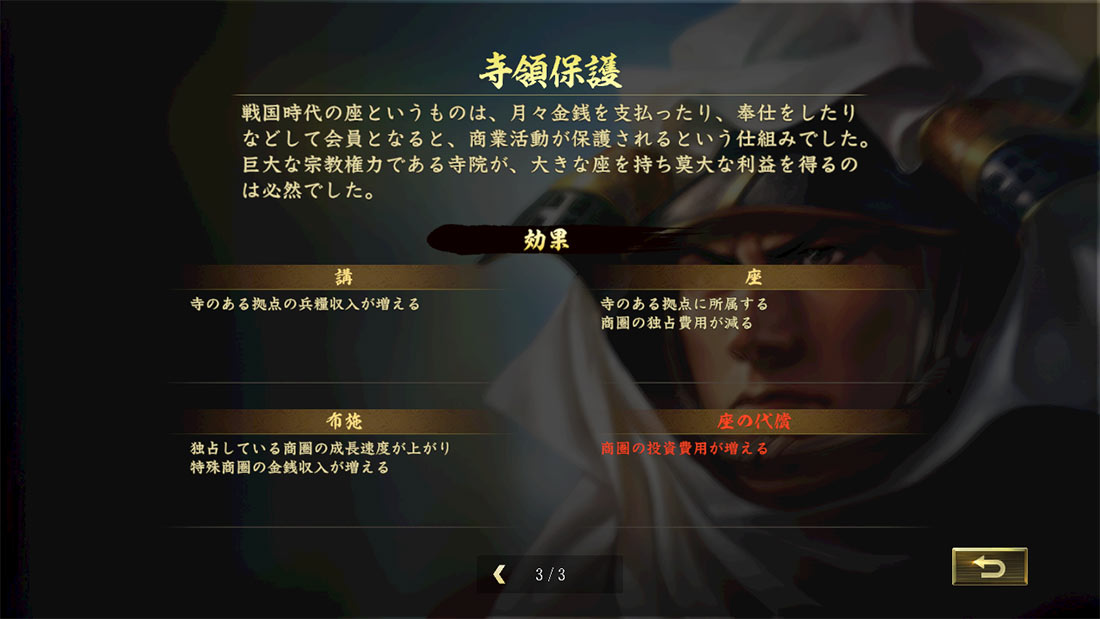 寺のある拠点の兵糧収入が増える「講」と、商圏の独占費用が減る「座」の効果により、内政基盤をしっかりと築いていける。さらに独占した商圏は成長速度も上がるため、いいことずくめ……のように見えるが、商圏への投資費用が増えるデメリットを抱えている。負担は大きいが商圏を独占するべきか、共生して他勢力からの投資を引き出すか。状況に応じた判断が求められる。