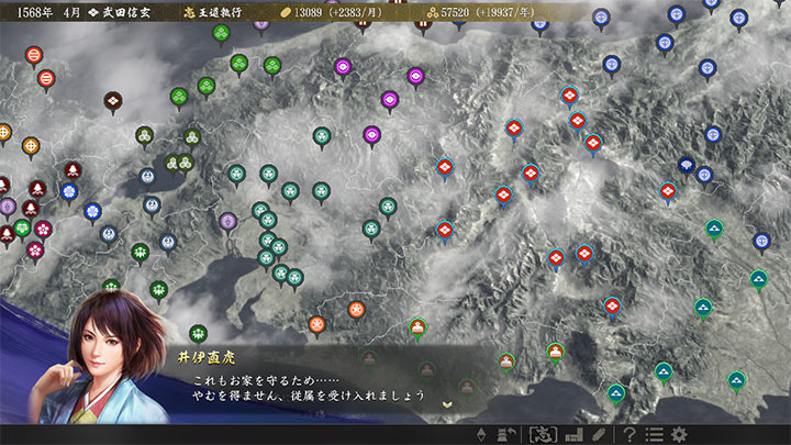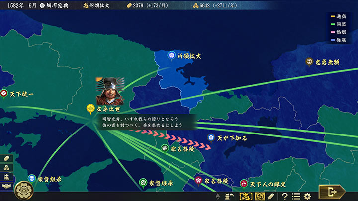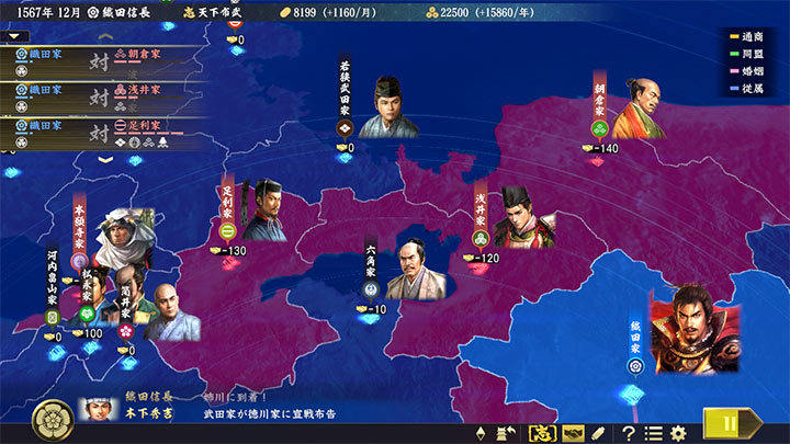 しかし、宣戦をすると他勢力が加勢しにくくなるため、守りやすいが攻めにくいという特徴があり、侵攻のタイミングが重要になる。