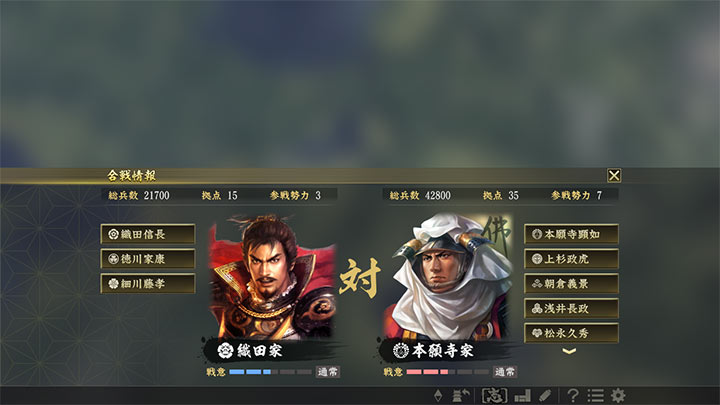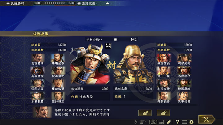 家康と戦う場合は、徳川家の優秀な家臣団と、織田家からの強力な援軍をまとめて相手にする状況が考えられるため、十分すぎるほどに戦力を整えて合戦に挑む必要がある。
