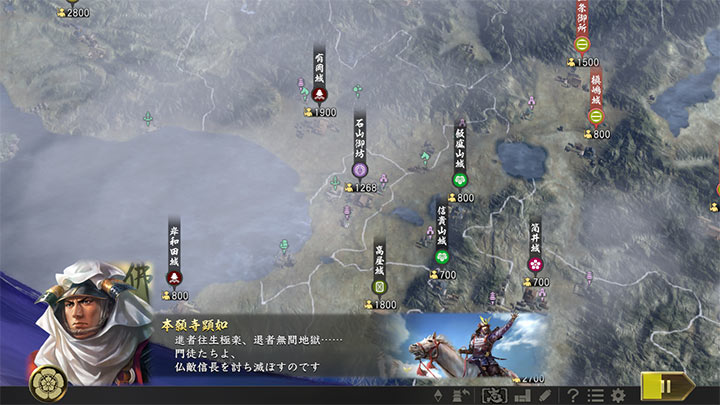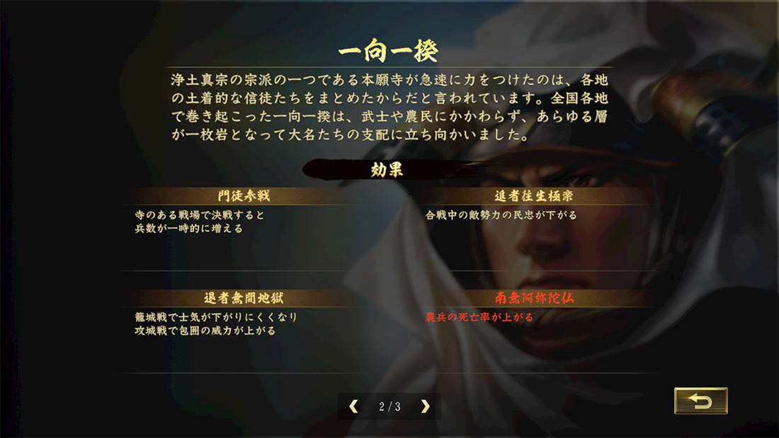 戦おうにも「進者往生極楽」の効果で自勢力の民忠が下げられるため安易に宣戦しづらく、さらに「退者無間地獄」の効果で籠城や包囲戦にも強いため、大変やっかいな相手だ。