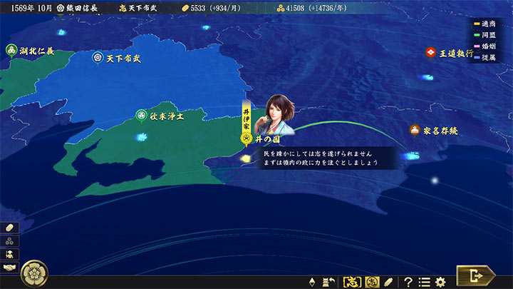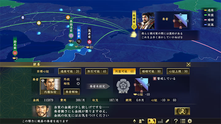織田家との同盟関係から生ずる効果をより引き出す「志特性」。同盟勢力との交渉が有利に働く、同盟勢力と同じ方策を採用した場合は必要な施策力を抑えられるなど、同盟勢力が大きいほど、自身の勢力運営が楽になる。