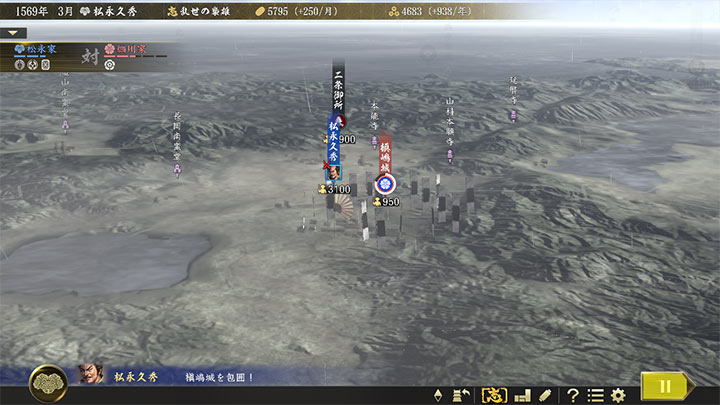 久秀最大の問題は、民に慕われていないこと。自勢力の民忠はつねに下がり続けてしまう。民忠のコントロールがお家の課題となろう。