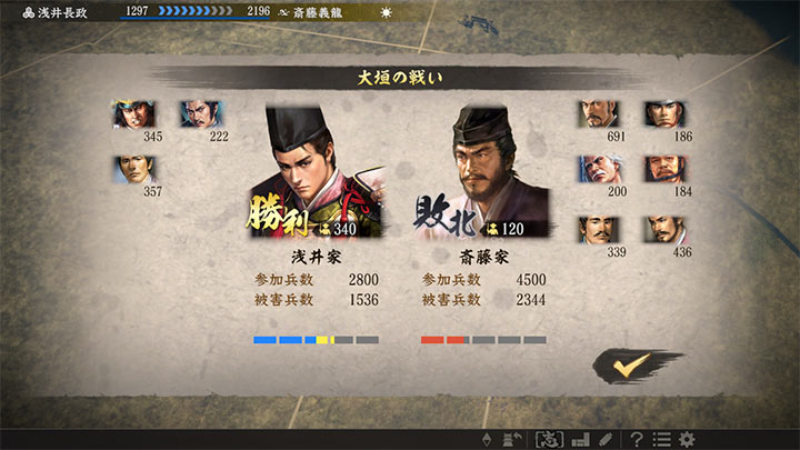 ただしこうして軍事が整い、いざ戦となった際に、長政の義を尊ぶ性格が若干足を引っ張る。「正道の戦」の効果により、決戦で勝利しても戦意が上がりにくいのだ。