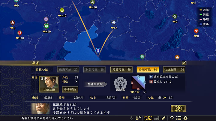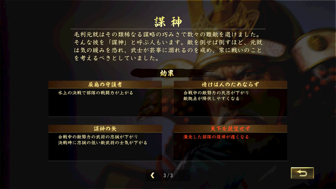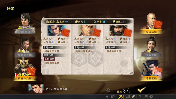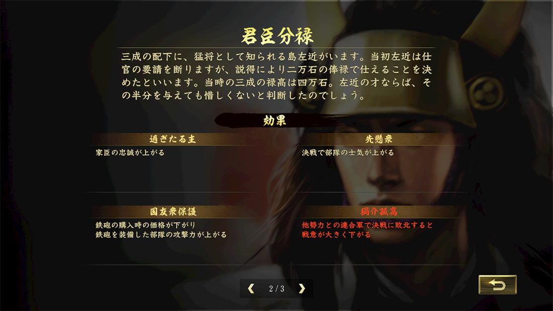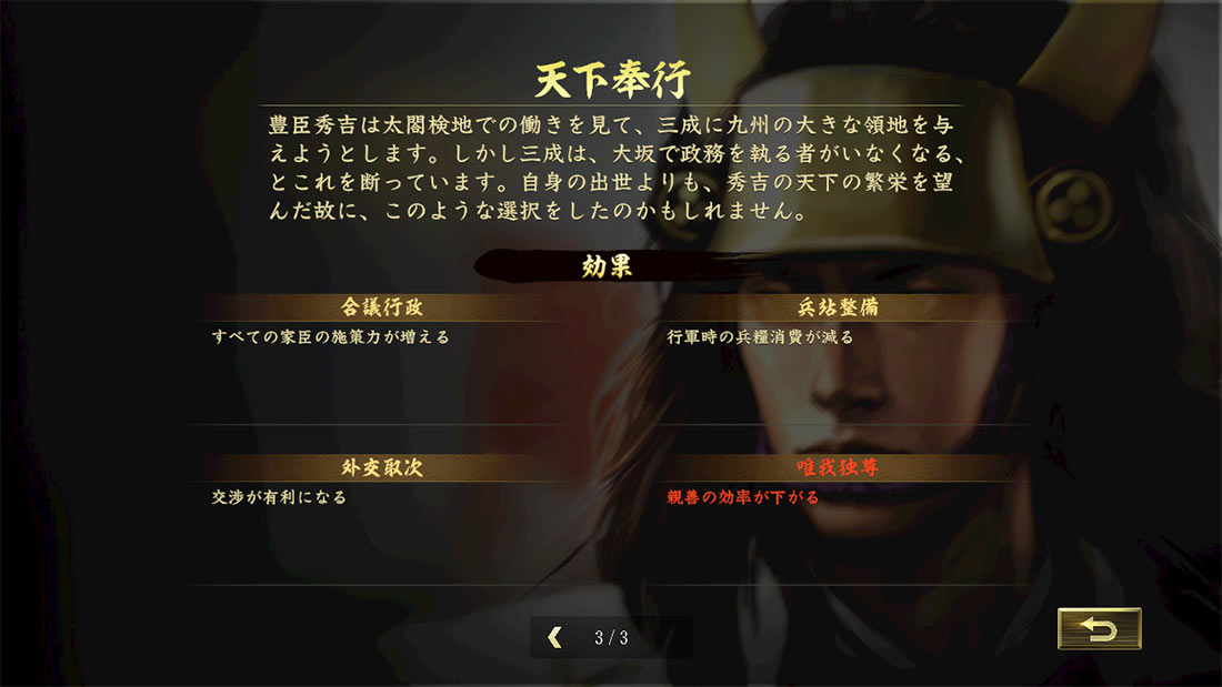 ただし、三成はひとりよがりな一面も持っていたため、親善の効果が下がってしまうデメリットもある。
