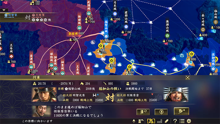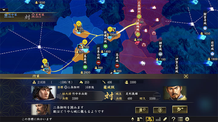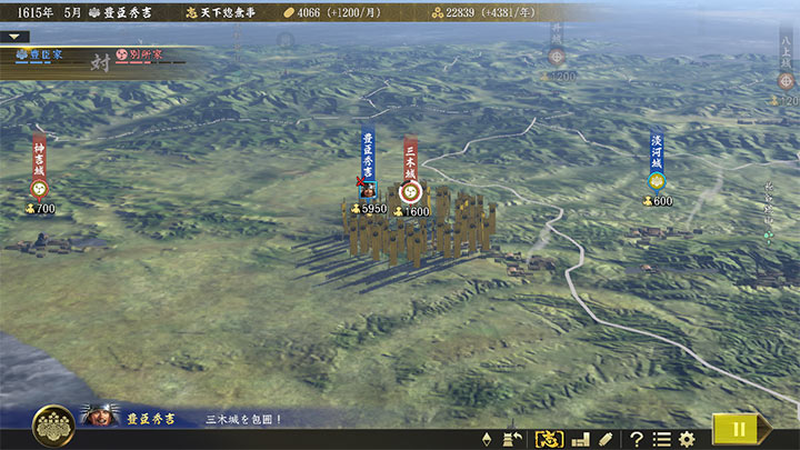 もし秀吉軍が侵攻してきた場合は、「城取名人」の効果を避けるため、拠点が包囲されないよう立ち回るべきだ。