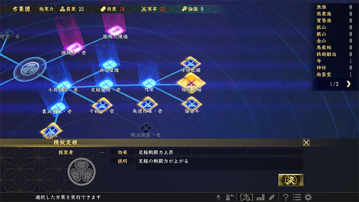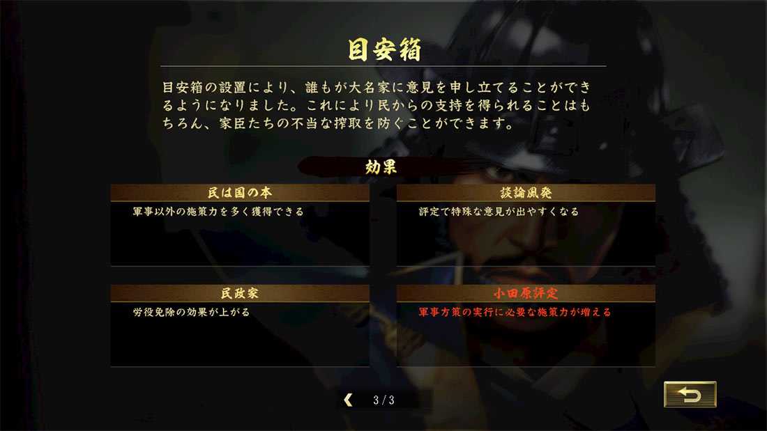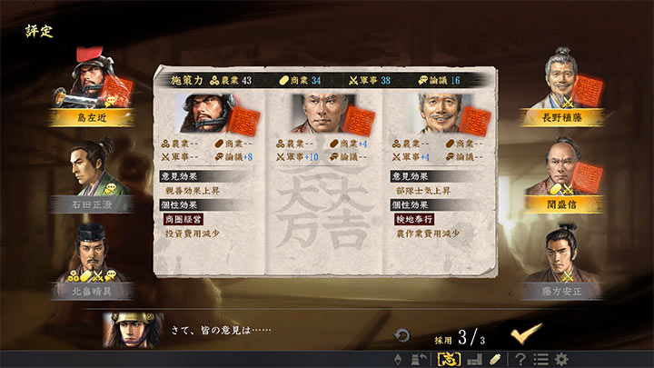 秀吉政権下で五奉行のひとりとして活躍した三成らしく、内政や外交を有利に進められる効果がそろっている。すべての家臣の施策力が増える「合議行政」と、交渉が有利になる「外交取次」のお陰で、勢力基盤を固めやすい。また、軍事面でも「兵站整備」で部隊運用をしやすい効果が得られる。