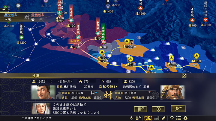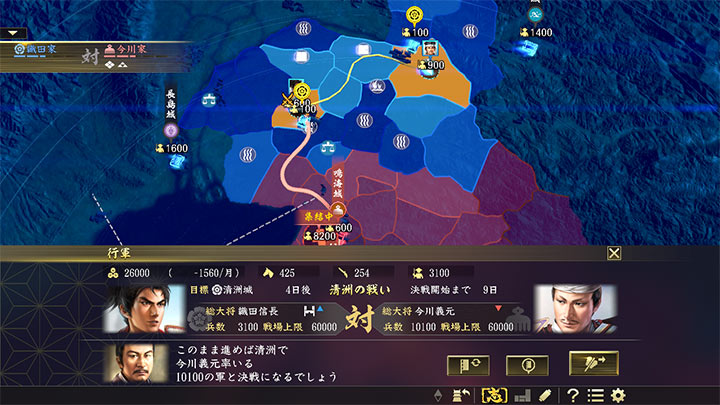 史実同様に上洛を目指し、まずは尾張を狙ってくる。しかし選択したシナリオや、武田家や北条家との関係次第では、伊豆・相模などの関東甲信の要衝を押さえにくる可能性もある。