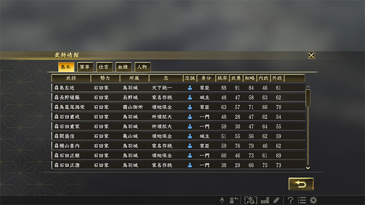 島左近を召し抱えた際のエピソードが思い起こされる「過ぎたる主」の効果は、家臣の忠誠が上がるというもの。これにより家臣団を掌握しやすい。また、近江が地盤の三成は、「国友衆保護」の効果で鉄砲の調達がしやすく、鉄砲部隊の攻撃力も高い。