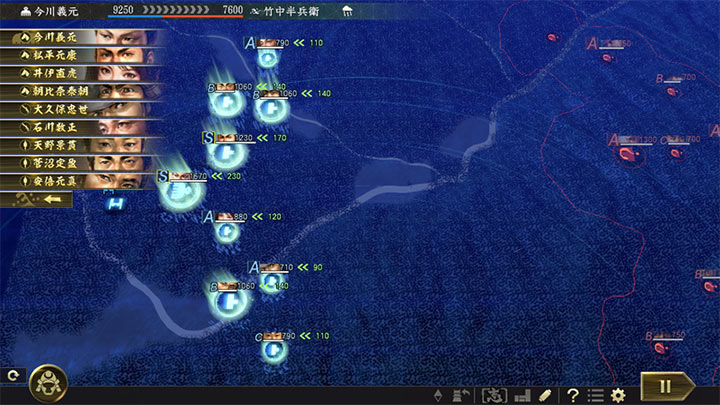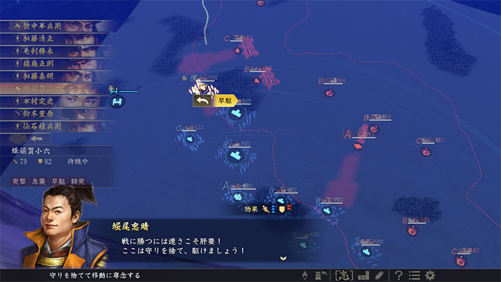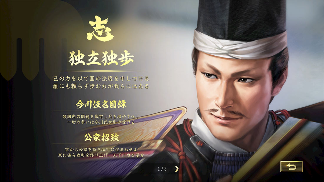 志特性「今川仮名目録」の効果も相まって、大部隊の運用機会が増す傾向にあるが、「輿の歩み」により決戦時に部隊の移動速度が低下してしまう。行軍時に隙が生まれぬよう心掛けたい。