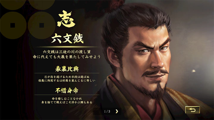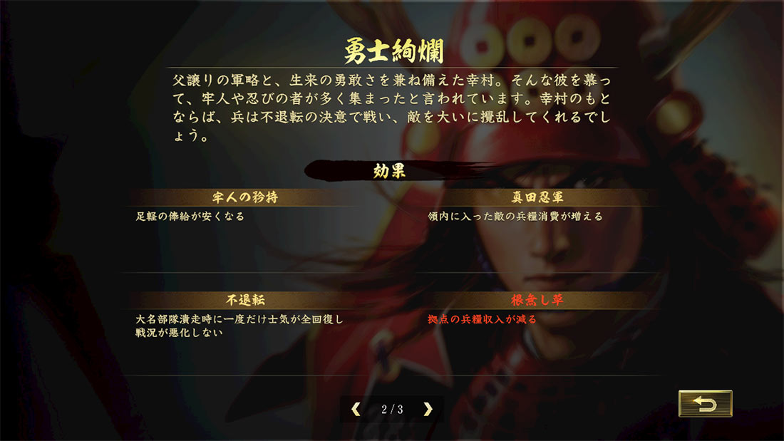 史実では「関ヶ原の戦い」で父・昌幸とともに西軍に加勢し、敗れた末、高野山に流罪となった幸村。志特性「勇士絢爛」で得られるメリットもデメリットも幸村のこうした背景が反映されている。家禄を失い“牢人”となった幸村は、「牢人の矜持」により足軽の俸給を安く抑えられる一方で、「根無し草」により拠点の兵糧収入は減ってしまう。しかし、こうした窮地すら脱する「不退転」の強さを備えている。