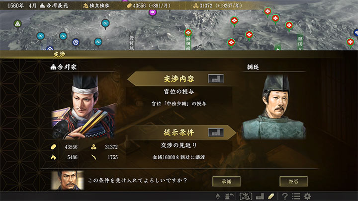 「朝廷外交」で朝廷の使者が来訪しやすくなり、そこで朝廷からの要求に応えると、他勢力の心証が上がる「滝口の武士」が効いてくる。これにより、他勢力の加勢や同盟での援軍を受けやすくなり、外部からの兵力調達につなげられる。
