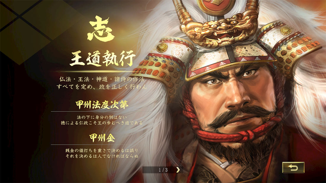 通常は家臣が提言をしてくる「評定」で、信玄自らが発言できる。軍備面では、馬産地で軍馬を増やしやすくなり、部隊に軍馬を装備させることで攻撃力が上がる。農業では、秋に収穫が少なくても民忠の低下を抑える効果がある。ただし、「甲州法度次第」の下では、足軽の俸給が増加するというデメリットもある。