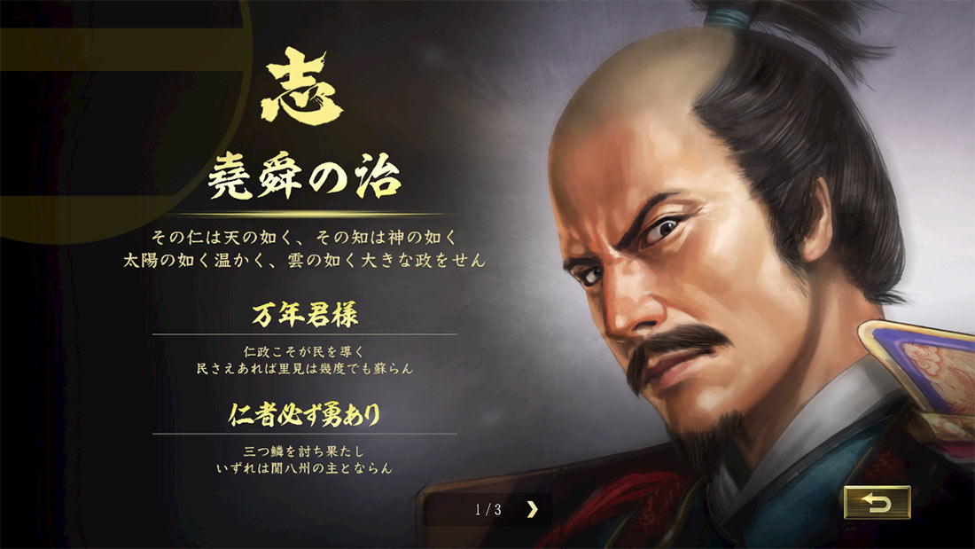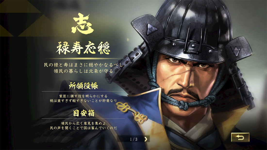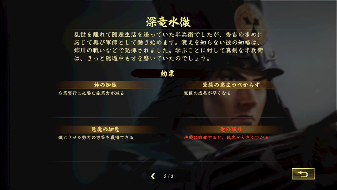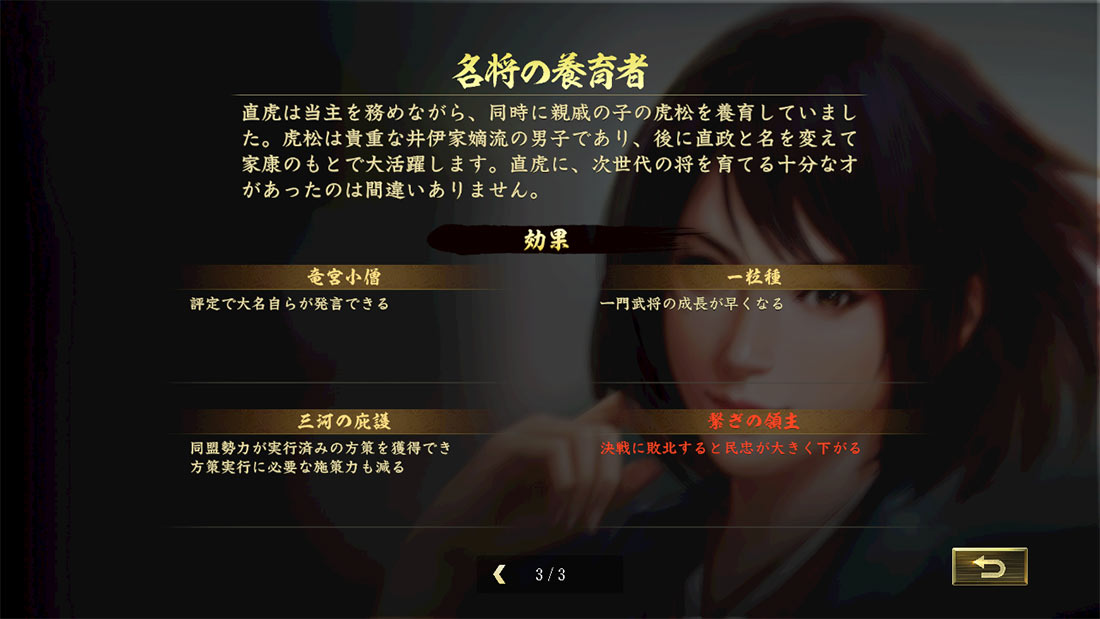 “徳川四天王”にまで上り詰めた直政を養育した手腕は、一門武将の成長が早い「一粒種」に表れている。拠点に増えた民を能力が高まった武将が束ねる、という好循環が見込める。さらに外交と領内統治が絡み合った「三河の庇護」が特徴的だ。同盟勢力が実行済みの方策を獲得でき、方策の実行に必要な施策力は減少するため、同盟勢力が多いほど領内統治は好転する。ただし次世代に“繋ぐ”責務は重く、決戦に敗北すると民忠は大きく下がる。