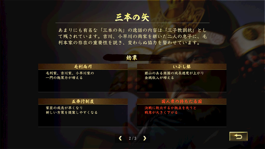 評定における毛利家・吉川家・小早川家の一門武将の提言が強化され、「施策力」が高まる。また、家臣の成長も早くなり、新しい方策を提案しやすくなるため、他家に先んじて「方策」による勢力強化を行える。銀山のある商圏の成長速度と金銭収入が増えるため、収入でも先手を打つことができる。